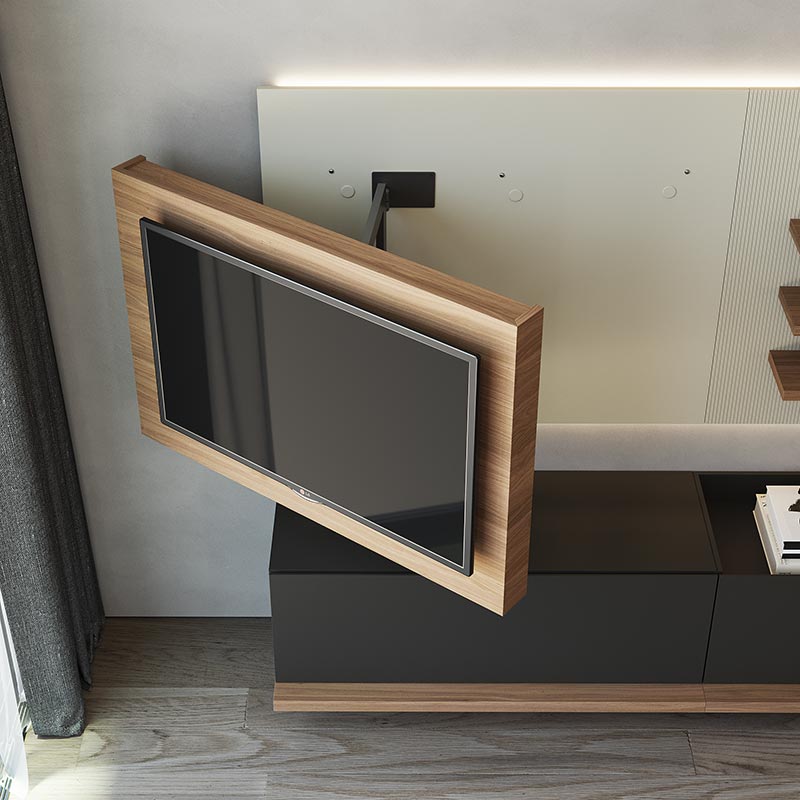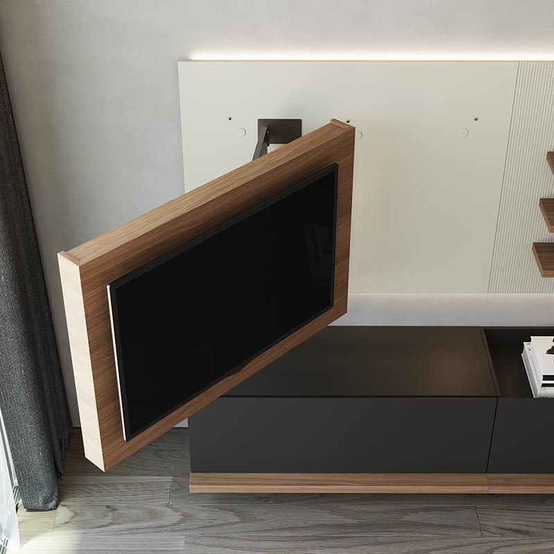 Il pannello tv X2 dalle linee essenziali e moderne è un perfetto connubio tra bellezza e praticità. Consente l’orientamento della tv su due lati, oltre che il mascheramento dei cavi.