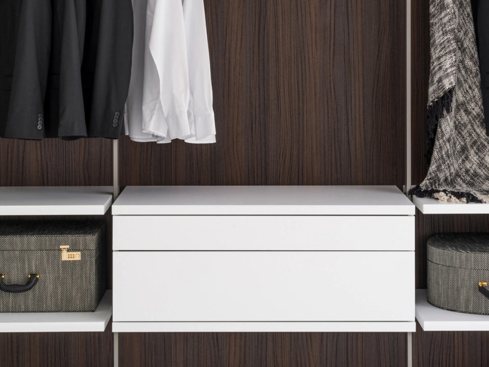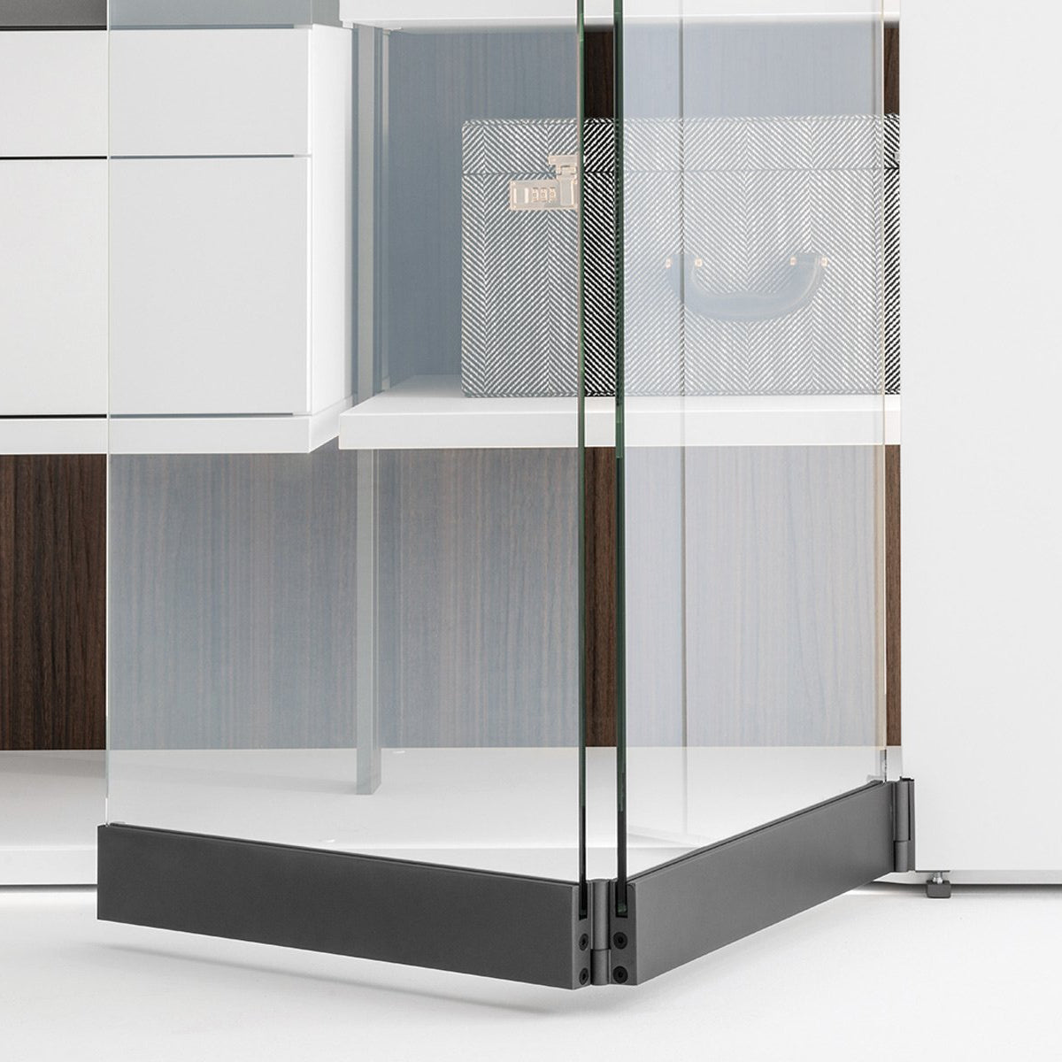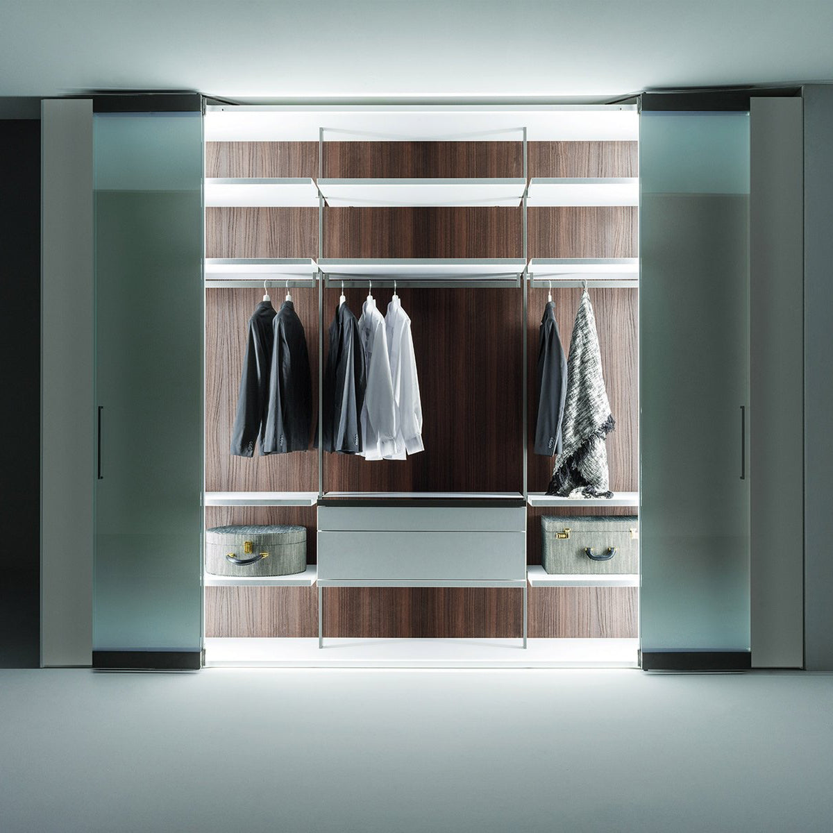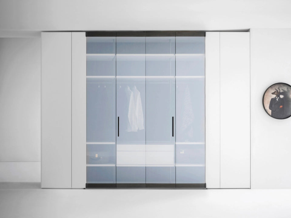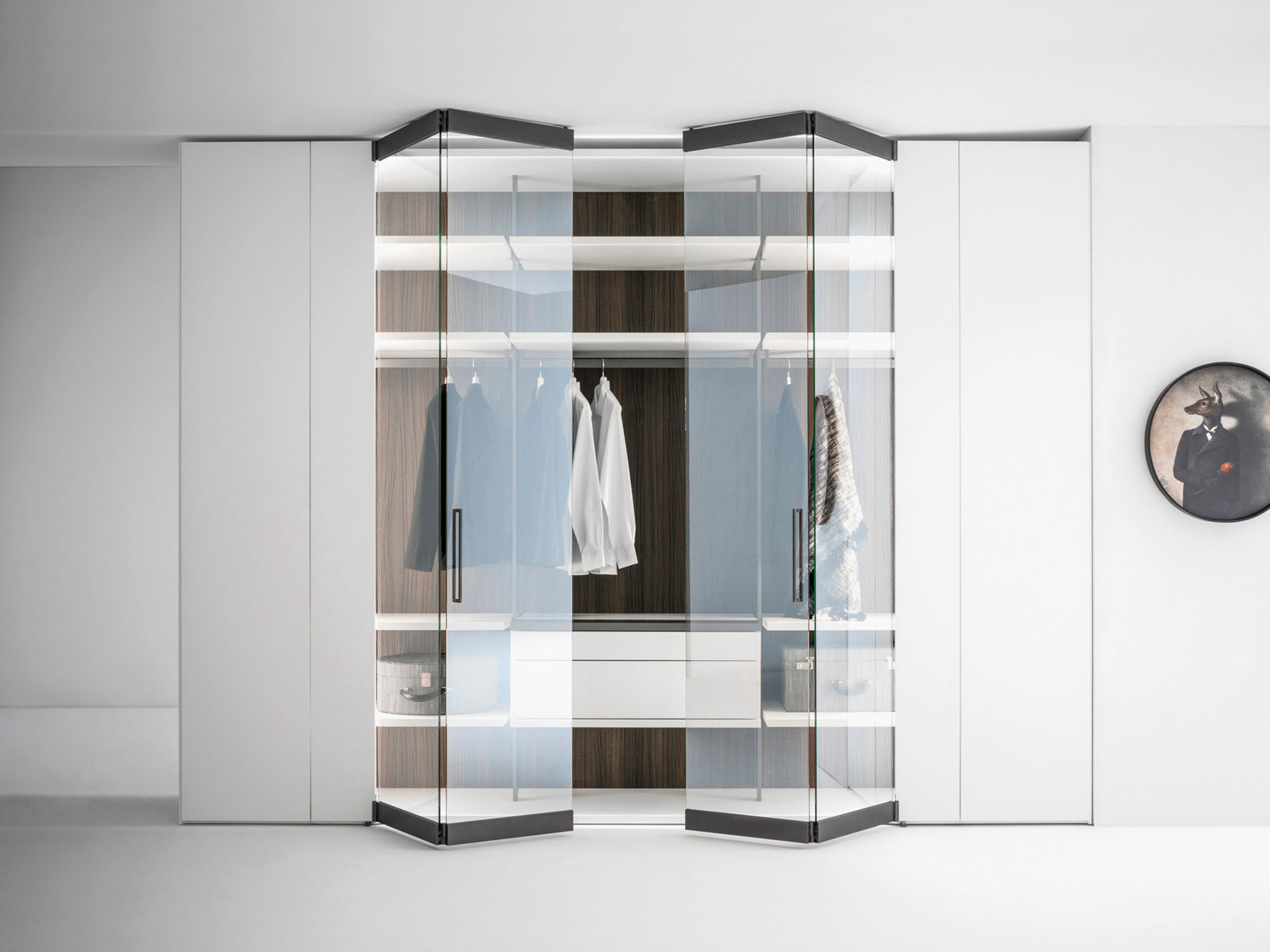 Negli armadi con le ante in vetro tutto rimane a vista, anche quando sono chiusi. L'elegante versione in vetro temperato dell’Apertura totale 50 alleggerisce visivamente il modulo, proteggendone il contenuto dalla polvere. La trasparenza del vetro aumenta il valore estetico della composizione e dona luminosità all’ambiente che la ospita. Puoi esprimere il tuo stile e gusto estetico scegliendo tra due diversi gradi di trasparenza: vetro Extrachiaro o Fumé.Nessuna regola, massima libertà di progettare: puoi scegliere le dimensioni, combinare tra loro diversi sistemi di apertura, così come affiancare ante laccate ad ante in vetro. In questo modo potrai lasciare a vista solo i capi che usi e nascondere quelli che indossi di meno. Tutti i sistemi offrono la possibilità di installare una soffusa illuminazione a led per donare eleganza ai tuoi spazi. Anche di sera.I montanti dividono l’interno del modulo in sezioni organizzando lo spazio in modo aperto, senza ostacoli. Puoi configurare i tuoi interni con appenderie, ripiani, portapantaloni, cassetti e molto altro.