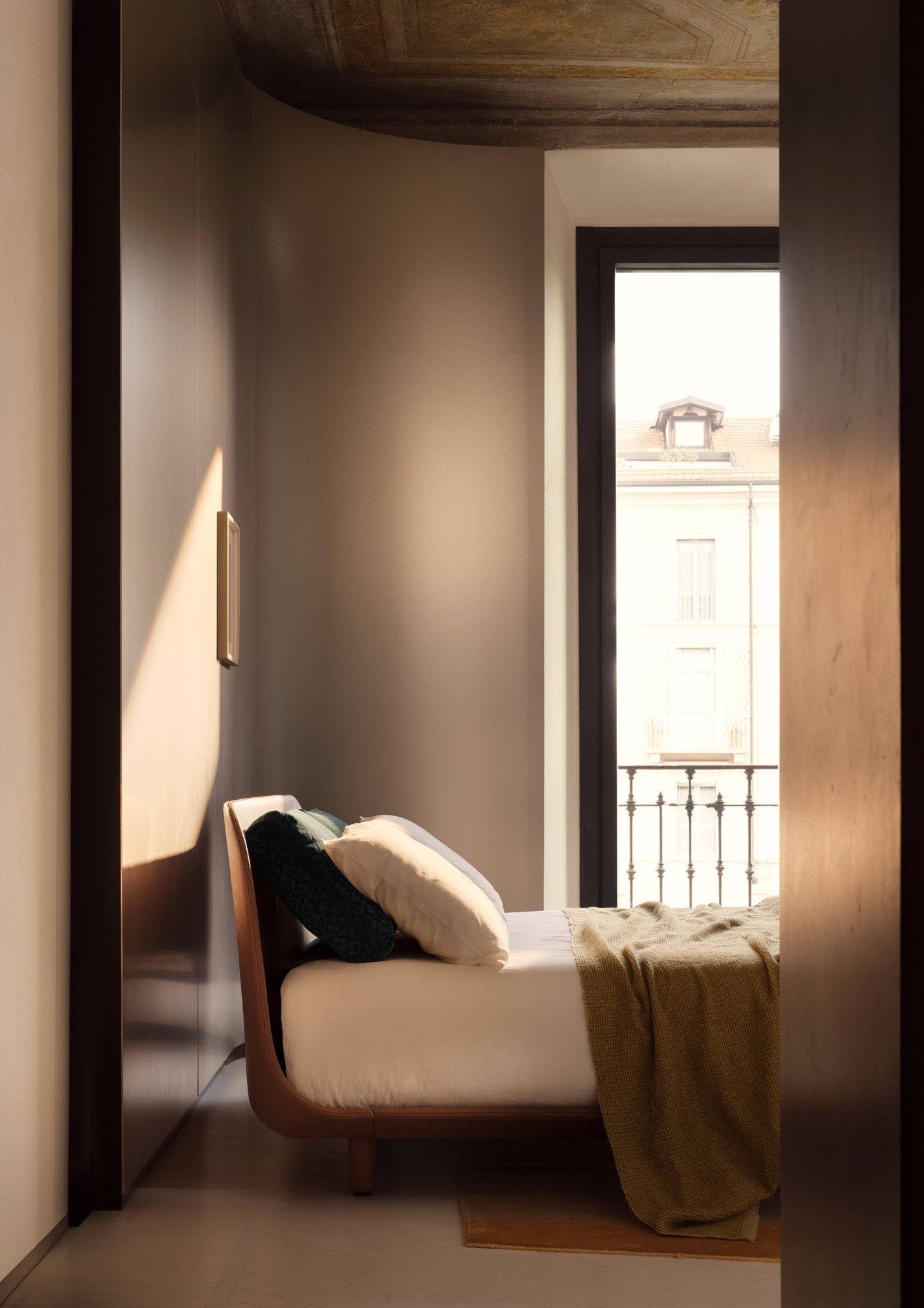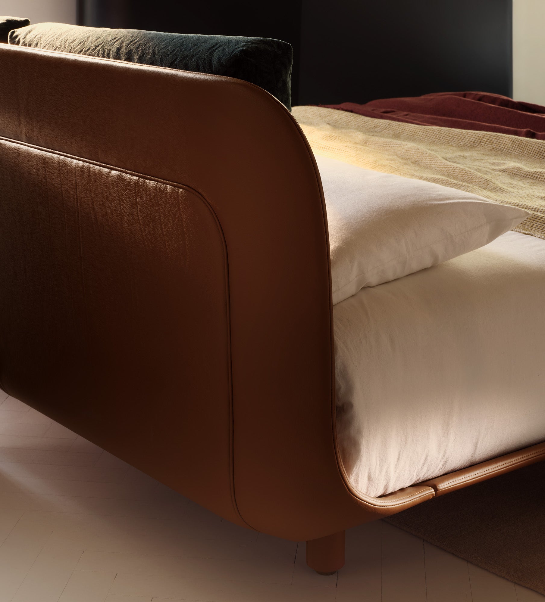 Tata è un omaggio silenzioso alla maestria artigianale, alla pazienza che dà forma alla bellezza attraverso gesti misurati e consapevoli. Nasce da un’essenza elegante, fatta di curve morbide e proporzioni essenziali, dove ogni linea racconta equilibrio e intimità. Il legno massello, vivo e autentico, si lascia vestire da un rivestimento in pelle applicato con cura artigianale, seguendo con delicatezza ogni profilo. I piedini arretrati, nascosti alla vista, fanno sì che il letto sembri sospeso, leggero, quasi etereo. La testiera e il giroletto, appena concavi, abbracciano il materasso e creano una forma accogliente, discreta ma presente. A completare la struttura, due cuscini rettangolari reclinabili e regolabili che uniscono sostegno e comfort con eleganza.